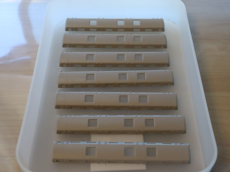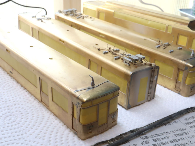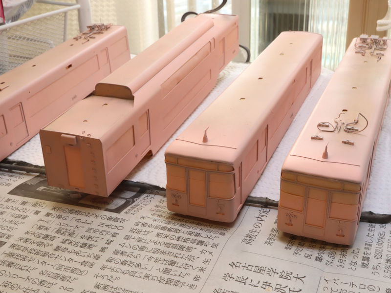 いよいよ車体の塗装です。前日にサンポールとクレンザー、中性洗剤で下準備しています。ミッチャクロンのプライマーを吹いた後、車内をアイボリーで塗装しマスキング後にサーフェイサーを吹き付けました。今日の塗装工程は朝から夕方までかかり2013年の新3000系以来で車両数が多い塗装のため大変疲れましたが、次ステップの特急色の塗装が楽しみです。