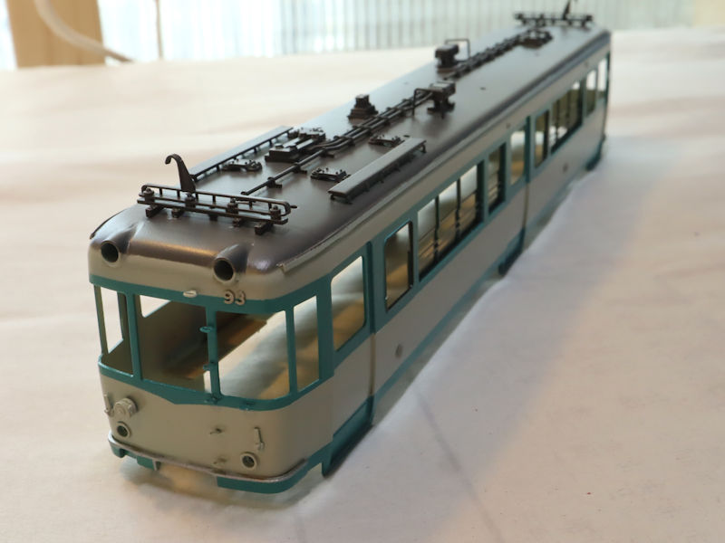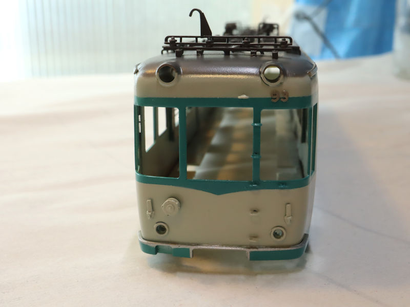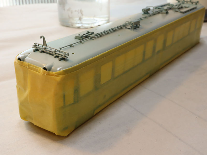 車体のマスキングを行い、80型淡緑の塗装を行いました。ゆっくりマスキングテープを剥がすと特徴的だった80形になってきました。