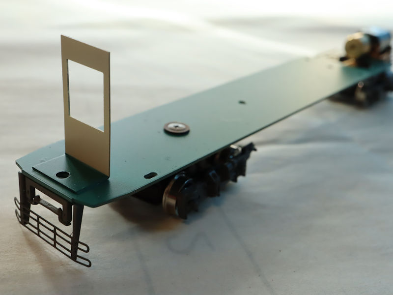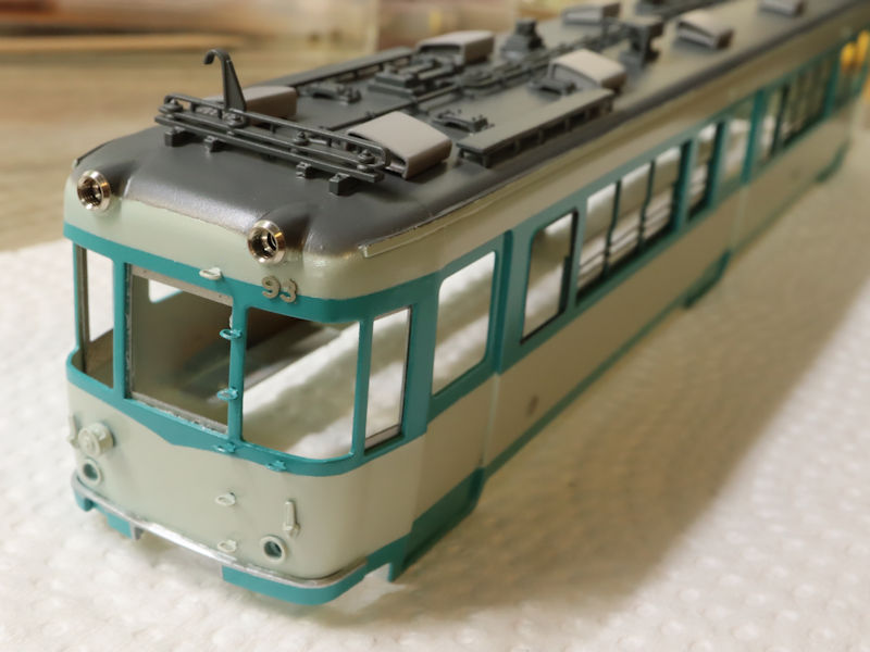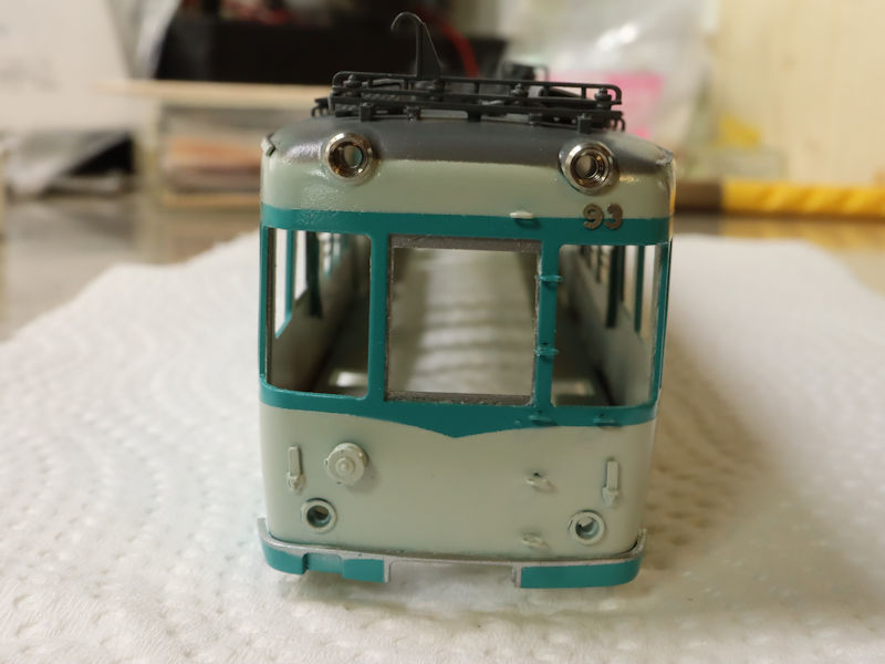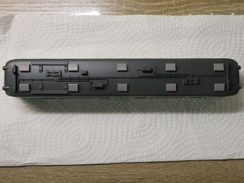 80形の仕上げを始めます。床板の両面と運転台仕切りを塗装後、台車と組み合わせてみます。